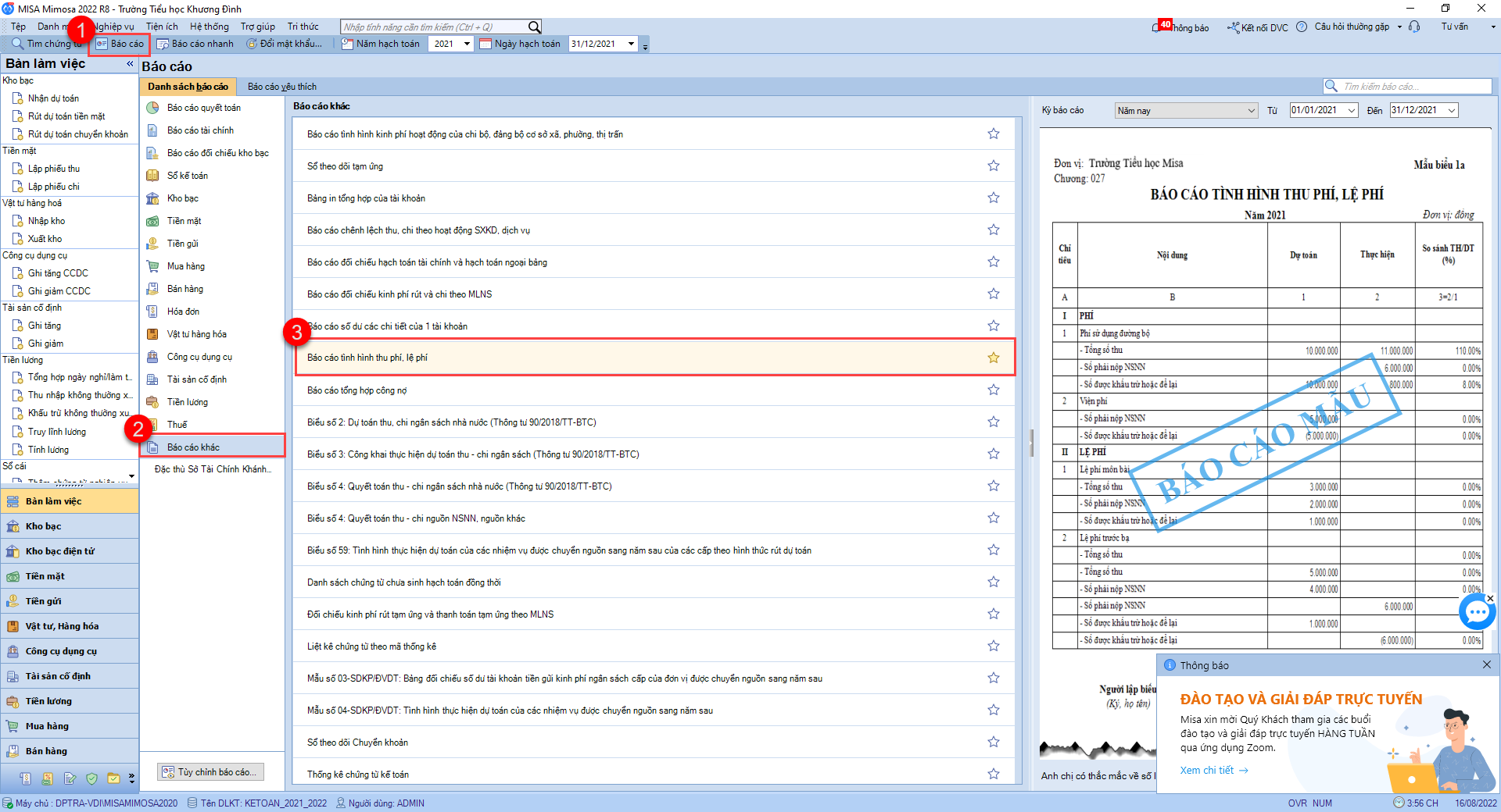 - Vào menu Báo cáo (1) \ Báo cáo khác (2), tại đây phần mềm đã bổ sung báo cáo Báo cáo tình hình thu phí, lệ phí (3)