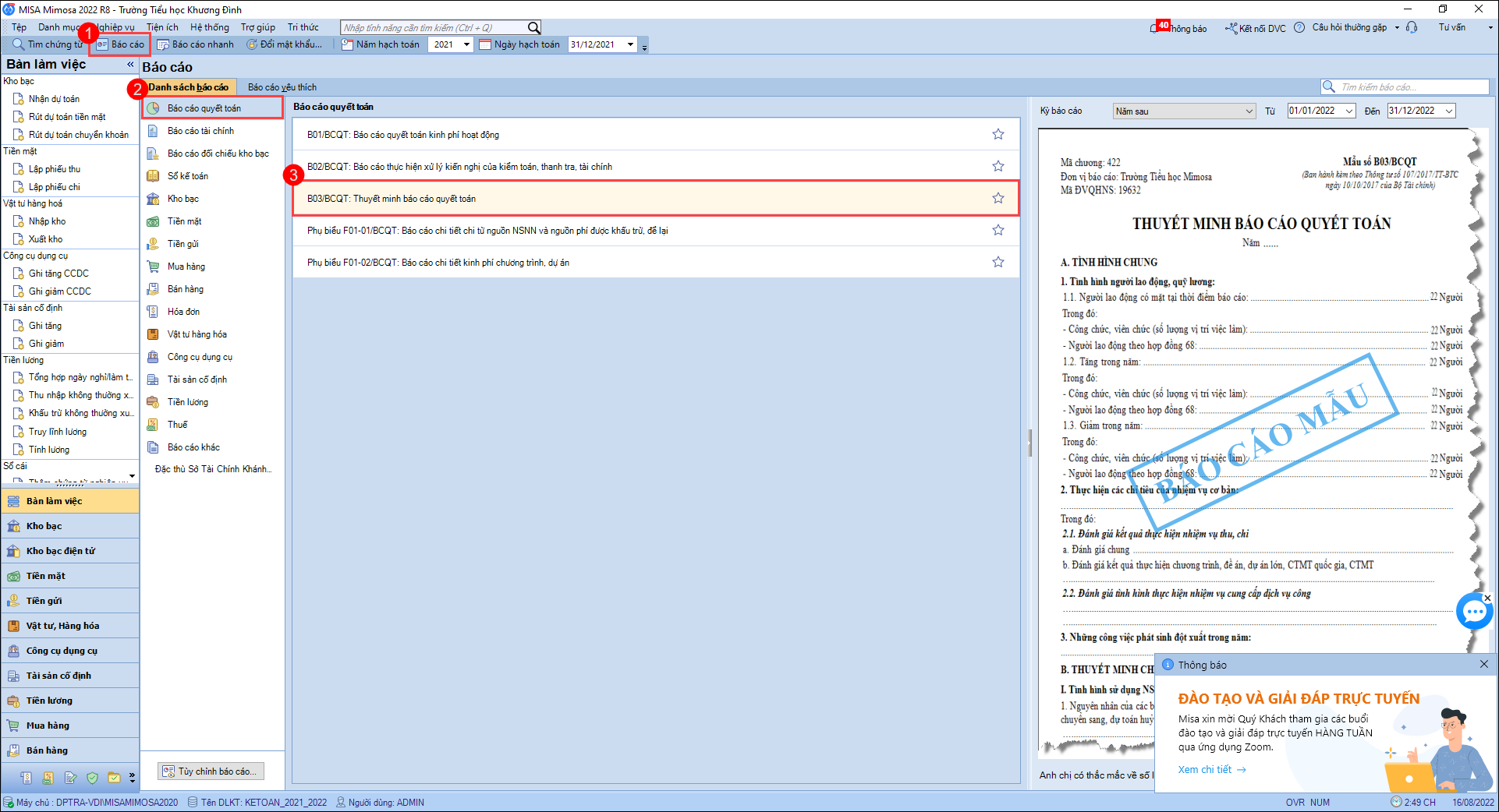 - Vào menu Báo cáo (1) \ Báo cáo quyết toán (2), tại đây phần mềm đã bổ sung báo cáo B03/BCQT: Thuyết minh báo cáo quyết toán (3)